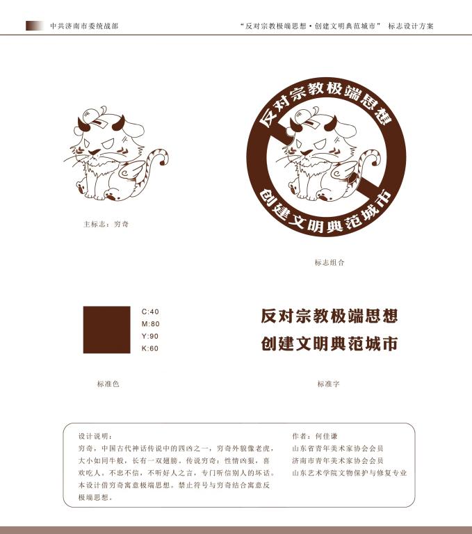 此次何佳谦同学设计的“穷奇”方案,题材来源于中国古代神话传说中的四凶之一,据《山海经·海内北经》记载“穷奇外貌像老虎,大小如同牛般,长有一双翅膀,性情凶狠,喜欢吃人。不忠不信,不听好人之言,专门听信别人的坏话”。设计方案以穷奇寓意极端思想,以禁止符号和穷奇图案的结合,突显出“反对宗教极端思想 创建文明典范城市”的活动主题,造型美观、富有创意,得到了专家领导的赞赏和认可,为助力济南市推进全国文明典范城市创建工作,贡献了山艺学子的智慧和力量。