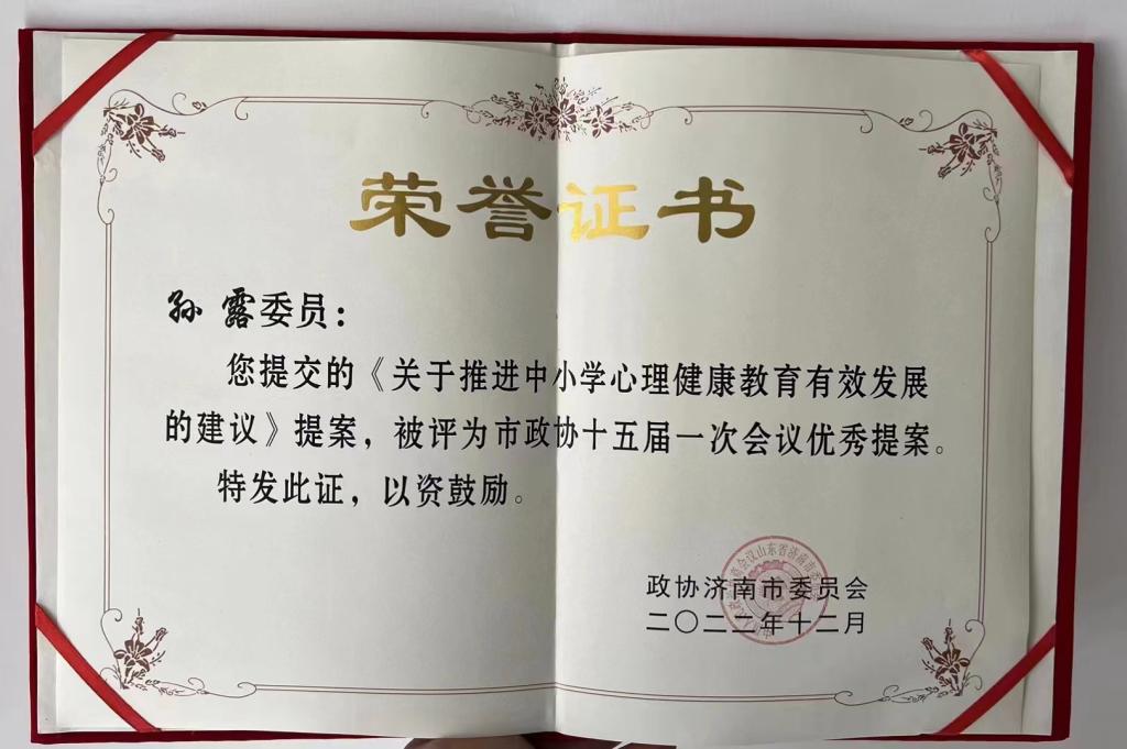 2022年12月26日至28日,济南市政协召开十五届二次会议,发布了《关于表彰在十五届一次会议提案工作中表现突出集体和个人的通报》,对58件优秀提案进行表彰,我校济南市政协委员、现代音乐学院孙露副教授提交的《关于推进中小学心理健康教育有效发展的建议》被评为“优秀提案”。
