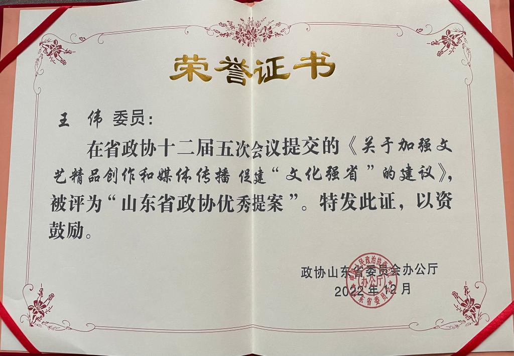 2022年12月20日,山东省政协十二届五十次主席会议审议通过了首届“最美政协人”推宣活动最终人选,我校省政协委员、民进山艺支部主委、艺术管理学院王伟教授光荣入选全省政协系统首届“最美政协人”提名人选。据悉,省政协2022年3月启动首届“最美政协人”推宣活动以来,经过组织推荐、初选提名、集中展示、遴选确定等环节,最终选出“最美政协人”30名,“最美政协人”提名人选18名。1月2日,山东省政协公布了省政协十二届四次会议以来优秀提案、先进提案承办单位和先进提案工作者名单,王伟教授《关于加强文艺精品创作和媒体传播促进“文化强省”的建议》获山东省政协十二届五次会议优秀提案。