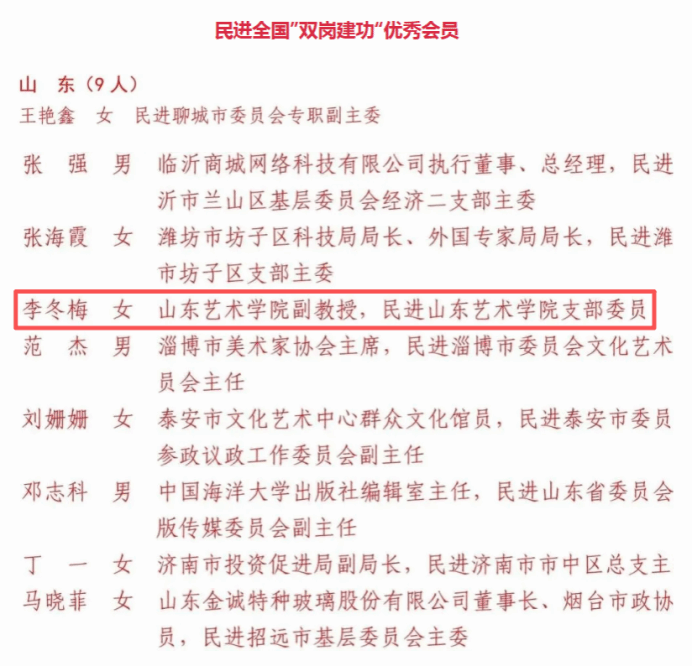 近日,庆祝民进成立80周年全国先进组织、优秀会员表彰大会在京召开。会议表彰了获得“民进全国先进地方组织”“民进全国先进基层组织”“民进全国‘双岗建功’优秀会员”荣誉称号的集体和个人,我校艺术管理学院教师李冬梅荣获“民进全国‘双岗建功’优秀会员”称号,是全省唯一获此殊荣的高校教师。